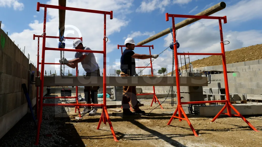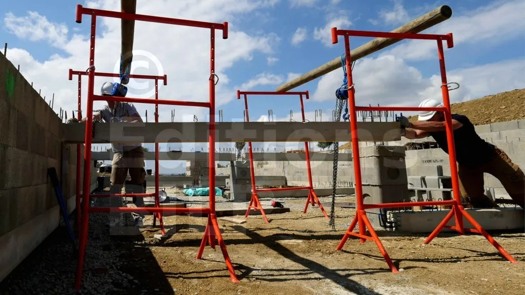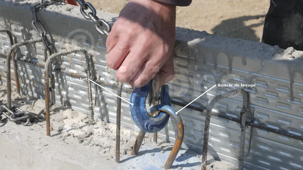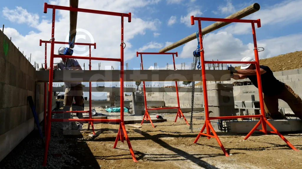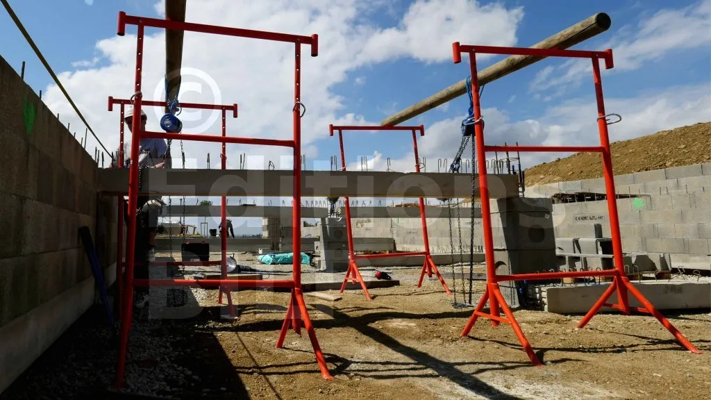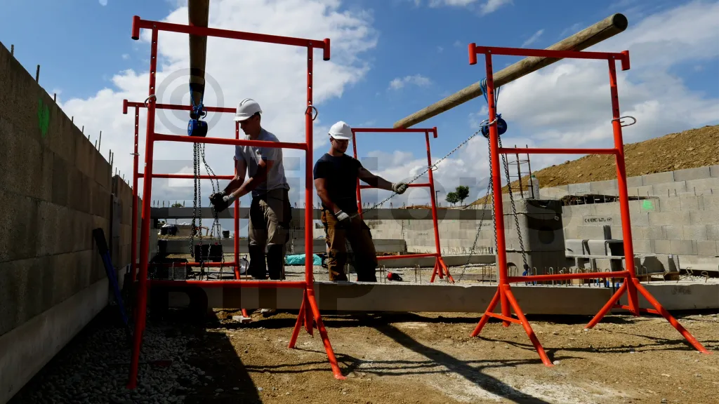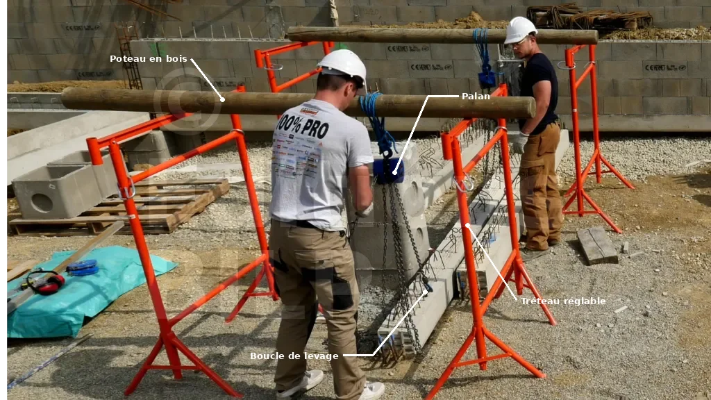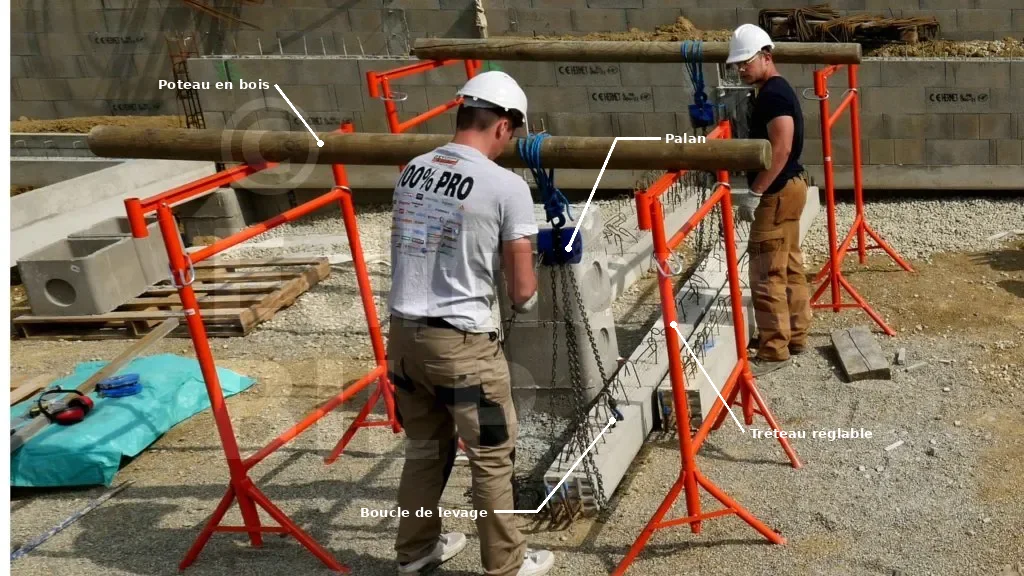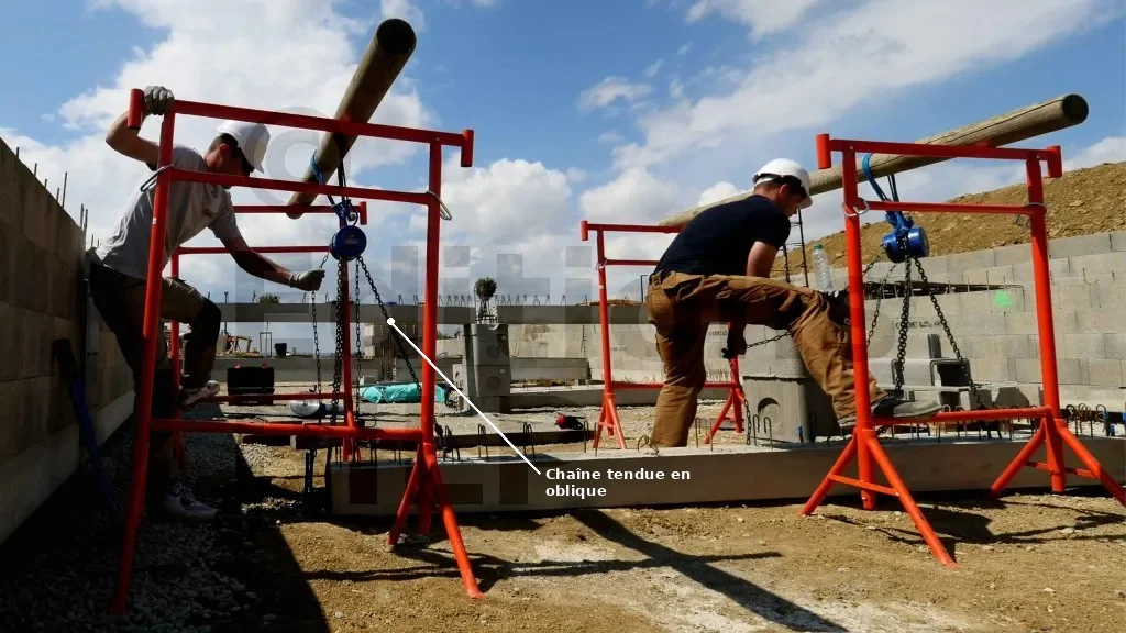 Les EPI (équipements de protection individuelle) sont très utiles pour prévenir les blessures : gants, casque et chaussures de sécurité. Les tréteaux peuvent se renverser sous le poids des longrines ; il est donc important de rester vigilant et de ne pas se placer sous les poteaux. La prudence est de rigueur. Manipuler les chaînes des palans avec précaution est également essentiel. Évitez de mettre les mains, les pieds ou toute autre partie du corps sous la longrine en cours de levage.