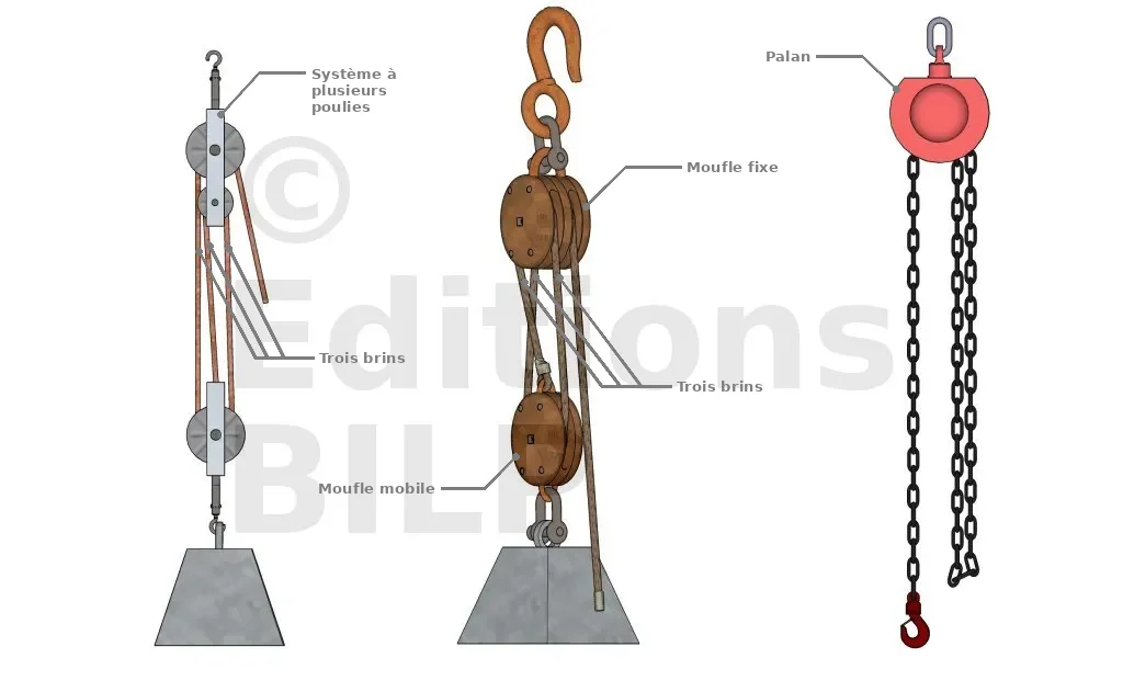 Ces trois systèmes (le système à plusieurs poulies, les moufles et les palans) fonctionnent de la même manière : ils amplifient la force fournie par l’utilisateur pour soulever une charge.