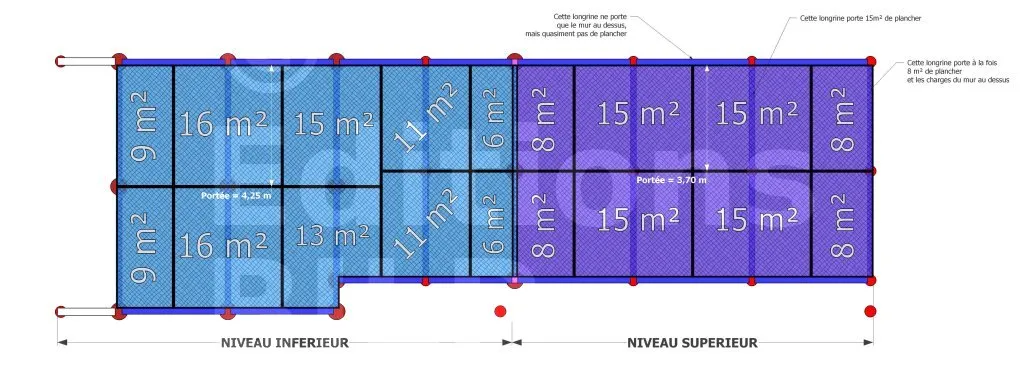 Par contre, les longrines périphériques 3 et 4 ne supportent pratiquement pas de plancher car aucune poutrelle n’y reposent. Mais elles supportent le poids des mur au dessus d’elles.