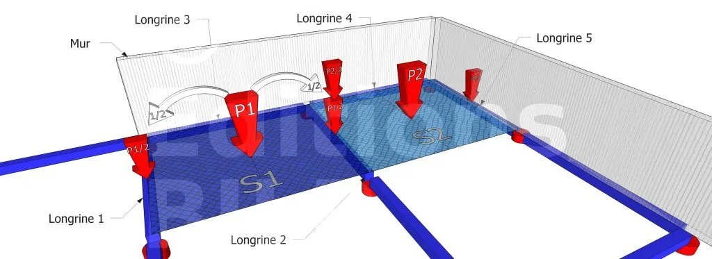 La surface S1 est portée par les longrines 1 et 2. Le poids P1 est réparti pour moitié sur les deux longrines. Elles se partagent le travail. Idem du côté de la surface S2. Du coup, la longrine 2 reçoit le poids de la moitié de S1 et le poids de la moitié de S2. Le poids de chaque surface est ainsi réparti de part et d’autre.