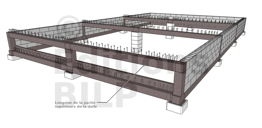 Elles jouent le rôle de poutre dans le mur de soubassement. Les armatures transversales (2) servent d’ancrage et/ou d’attente pour le mur en bloc à bancher. Le dimensionnement et la disposition des longrines (1) ont été traités dans l’article Le dimensionnement.