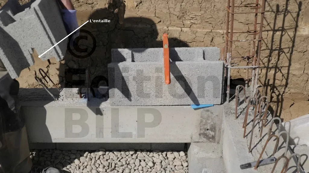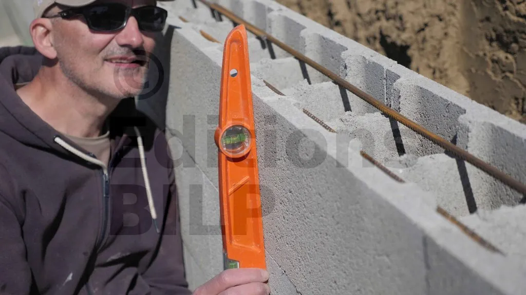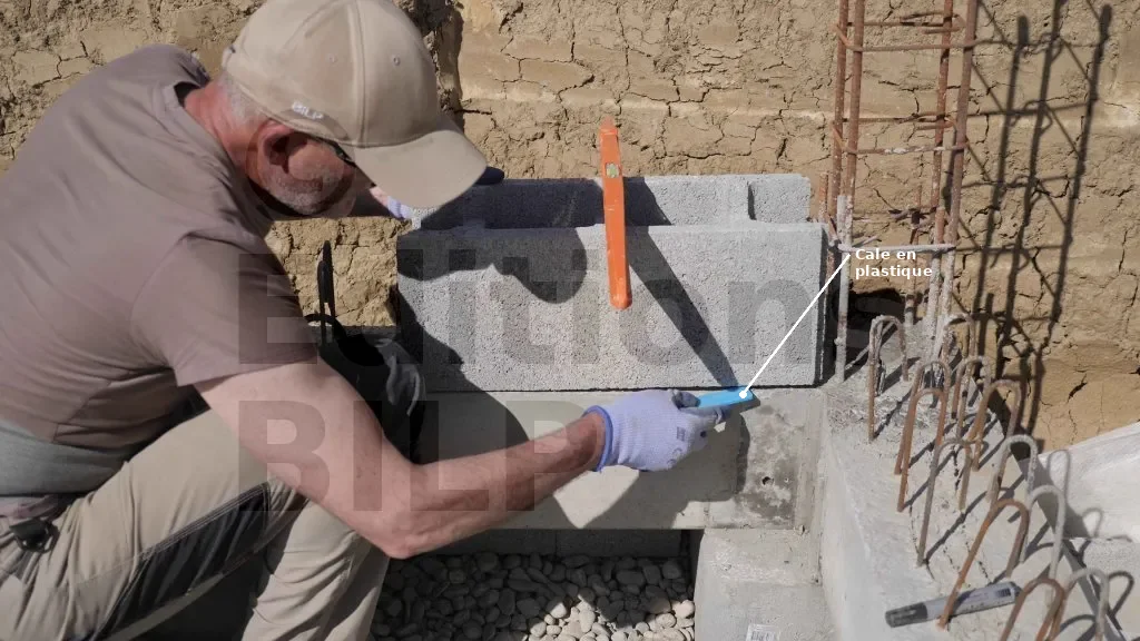 Des cales en plastique peuvent être utilisées pour régler le niveau des parpaings.