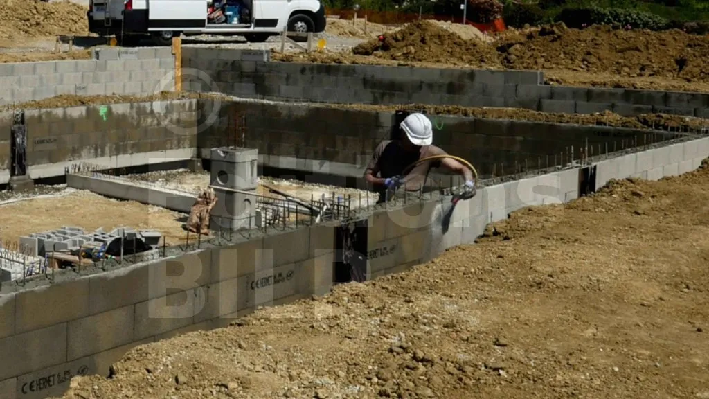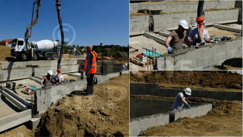 Le coulage du béton peut être effectué manuellement, mais cette méthode est trop pénible. Pour réaliser cette tâche avec une pompe à béton, il faut au moins trois opérateurs. Le premier guide l’extrémité de la pompe dans les alvéoles, le deuxième effectue l’aiguillage du béton, c’est-à-dire qu’il vibre ou remue le béton avec un fer à béton dans toutes les directions afin d’éliminer les vides et les bulles d’air, et pour que le béton pénètre bien dans les alvéoles des blocs à bancher. Le dernier opérateur égalise ensuite le niveau du béton avec une taloche.