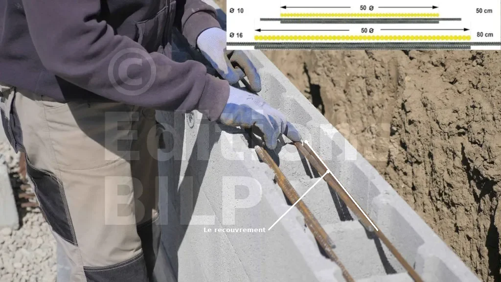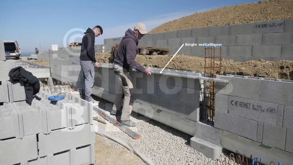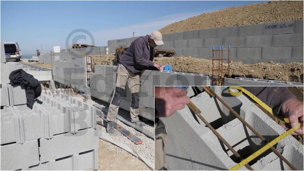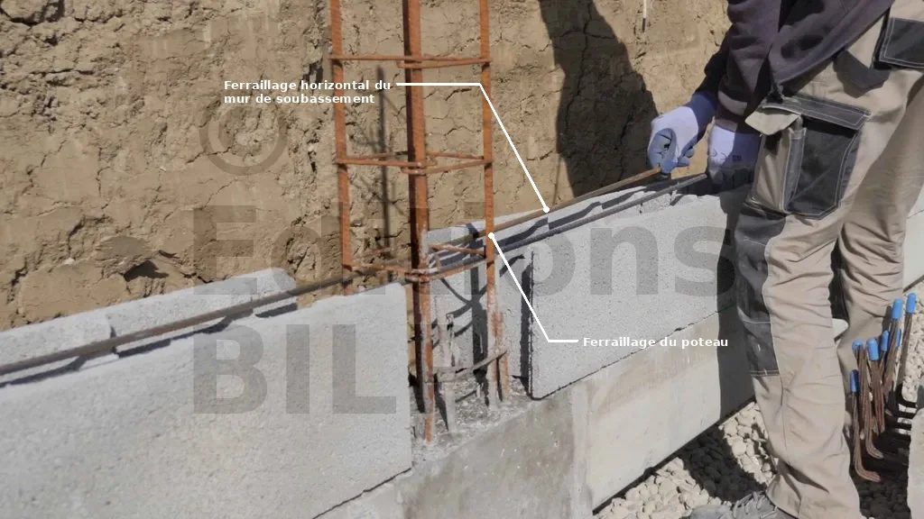 Le coulage des murs, des poteaux et des chaînages d’angle est réalisé en même temps. L’article "les coffrages" traite la mise en œuvre de tous les coffrages pour la réalisation du mur de soubassement.