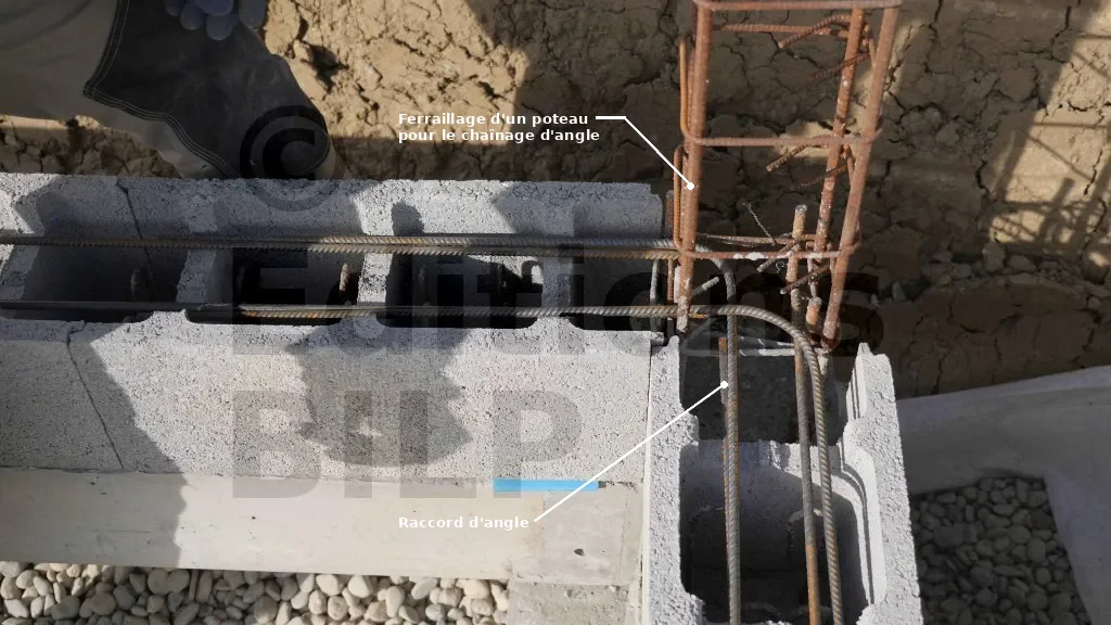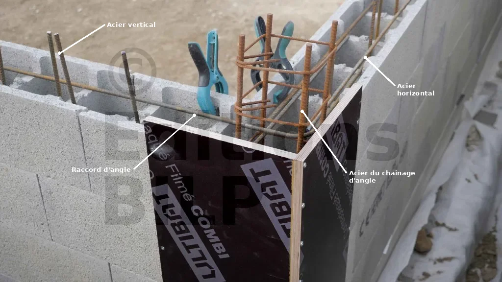 Des aciers en forme de "L" (raccords d’angle) ont été mis en place pour consolider les murs sur les angles.