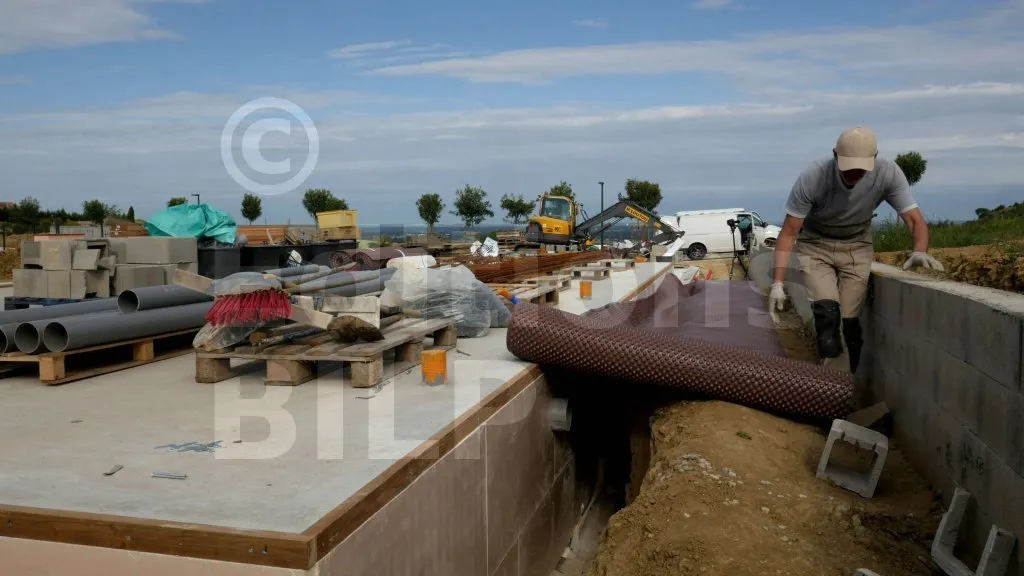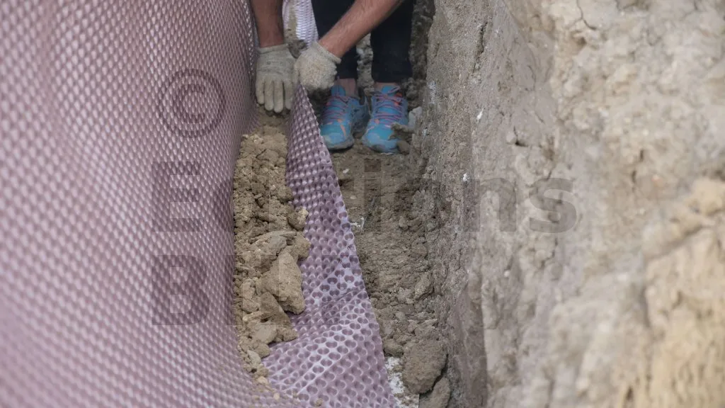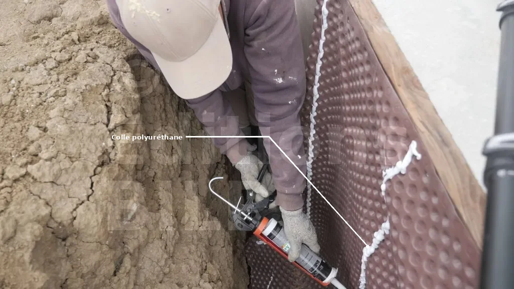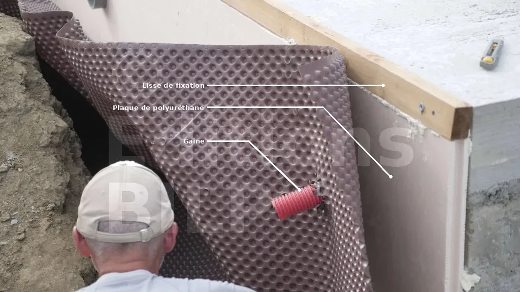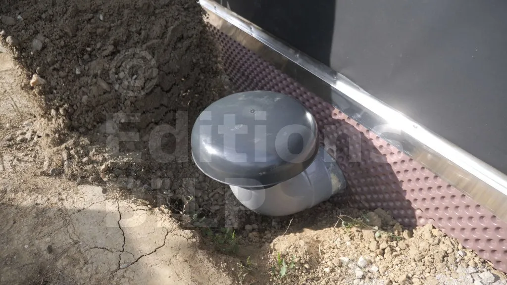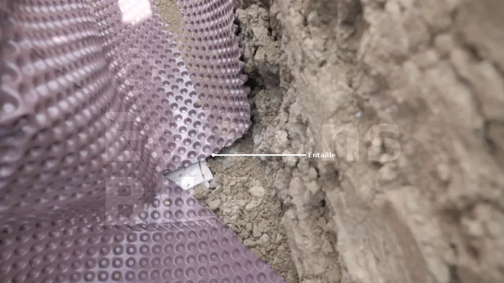 Sur ce projet, les membranes n’ont pas été fixées contre les panneaux d’isolant en polyuréthane, car le poids et la pression de la terre vont les plaquer contre les parois. Avant de procéder au remblayage, mettez du gravier sur la partie repliée au pied du mur, puis tirez sur cette partie repliée afin que la membrane se plaque bien contre les parois du mur, évitant ainsi les vides entre la membrane et les parois du mur.