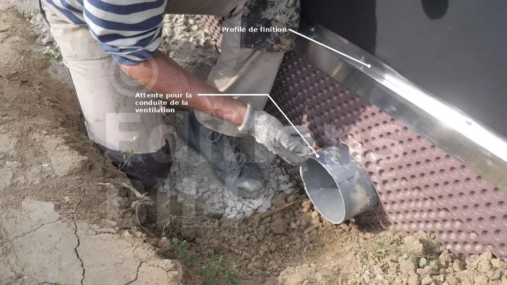 L’étanchéification du vide sanitaire consiste à mettre en place une membrane d’étanchéité contre les panneaux isolants en polyuréthane.