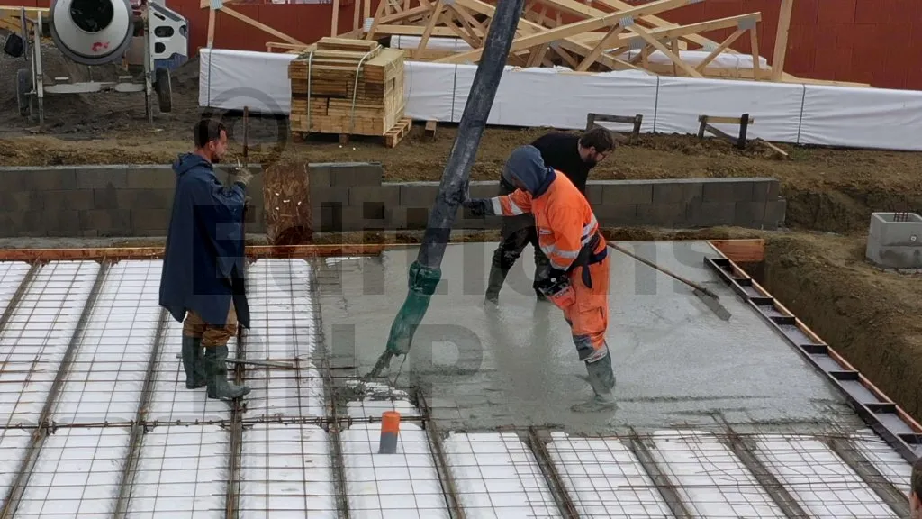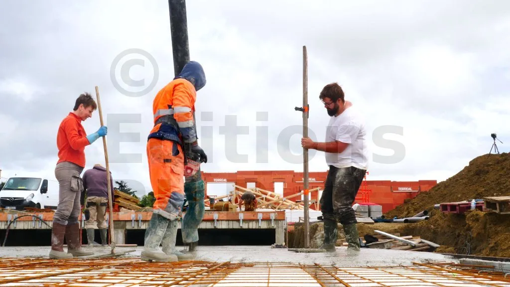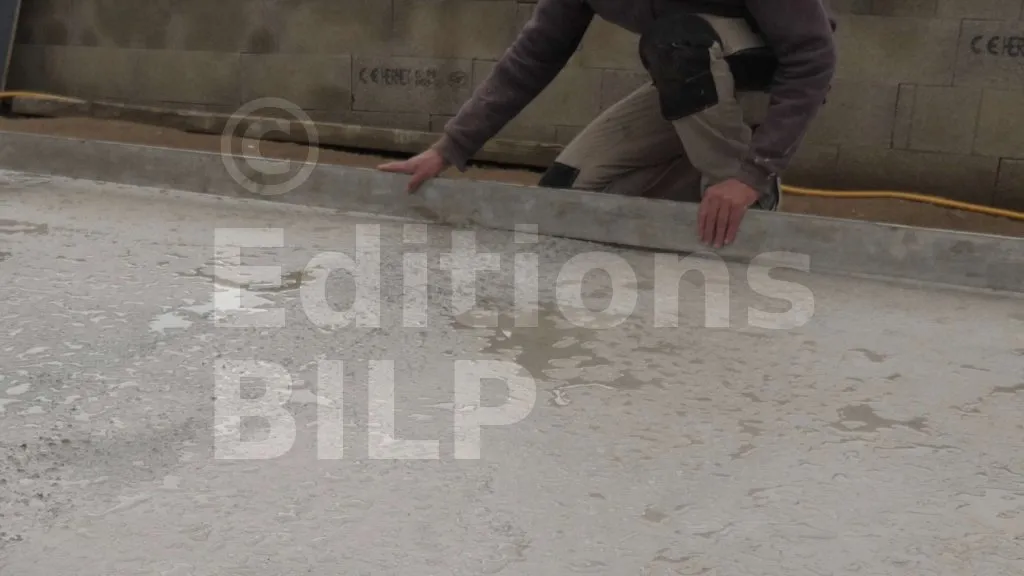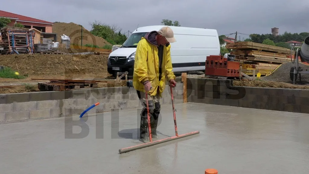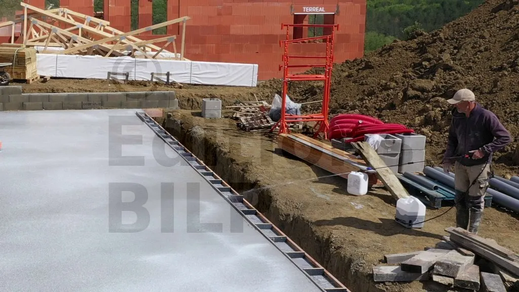 En général, avant de couler le béton, il faut poser des guides pour régler l’épaisseur de la dalle. Cependant, pour le projet Maison BILP, la surface de la dalle étant très grande, l’installation de ces guides prendrait beaucoup de temps.