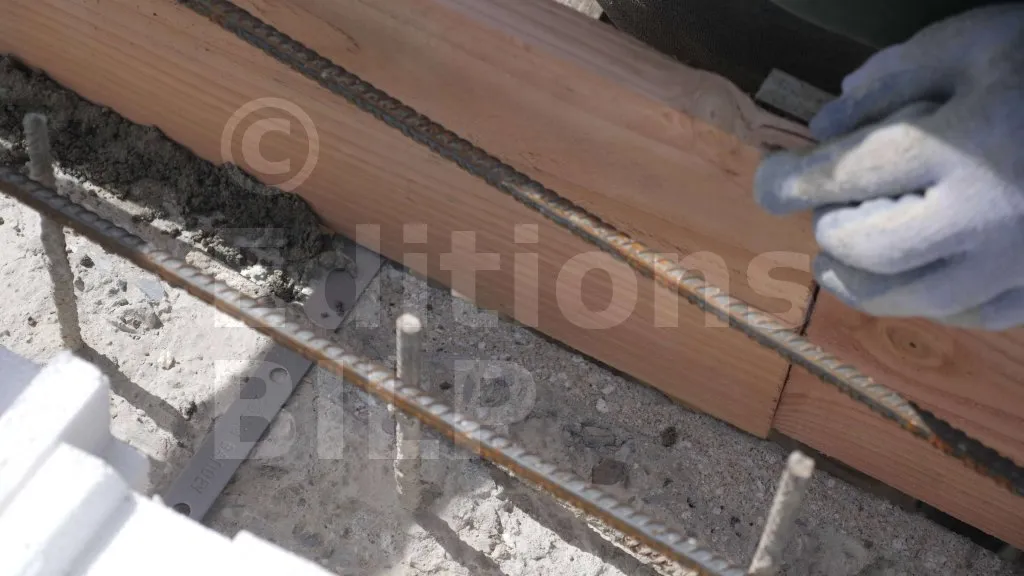 Ces barres font partie à la fois du ferraillage de la dalle et des longrines. Elles sont fixées aux crochets des armatures transversales des longrines. Après la mise en place des barres de montage, les étriers de fermeture sont fixés sur les deux barres de montage de la longrine ainsi que sur les armatures transversales de celle-ci.