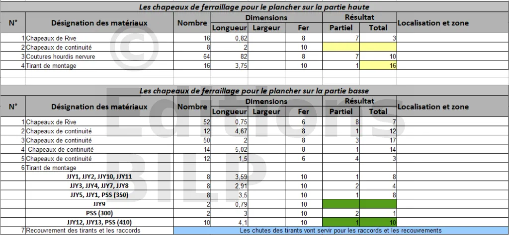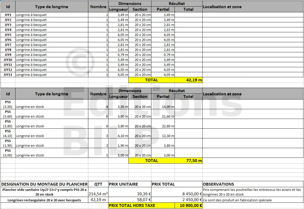 Les longrines ont été numérotées selon le plan de pose. Les longrines à becquet sont produites sur commande avec un délai de fabrication minimum de trois semaines selon notre fabricant. La fourniture des poutrelles et des entrevous est incluse dans le prix des longrines en stock (PSS).