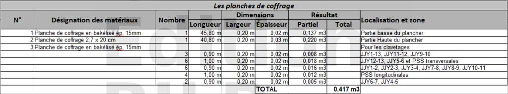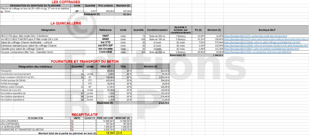La réalisation en autoconstruction du plancher du projet Maison BILP est estimée à 18 947,23 €. Une estimation d’un plancher partiellement en bois a été réalisée dans l’article Estimation du prix du plancher mixte bois/béton..