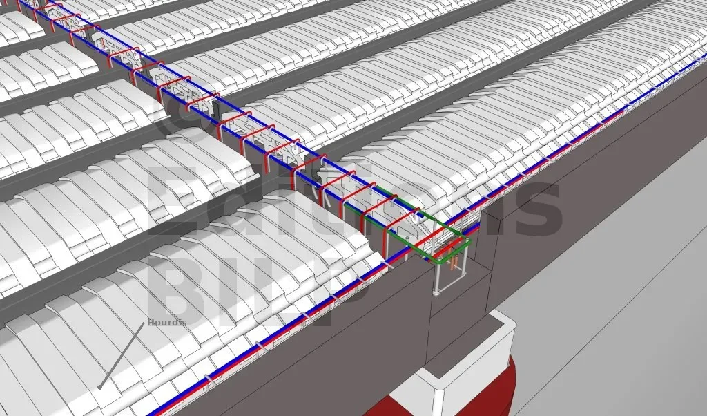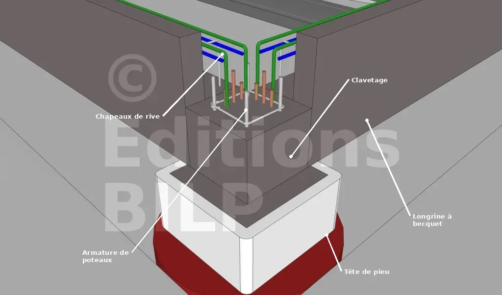 Le clavetage se fait au niveau des nœuds et permet d’assurer la liaison mécanique entre les longrines et les têtes de pieux. Pour ce faire, des coffrages doivent être mis en place au niveau de chaque nœud avant le coulage du béton.