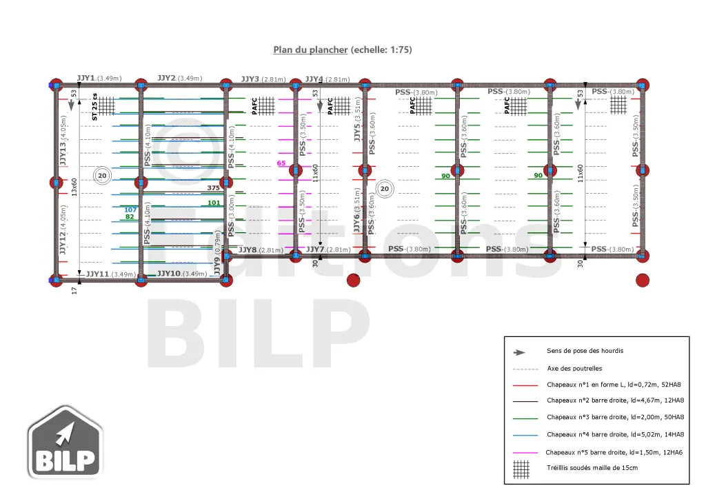Les informations qui ont été fournies au bureau d’études pour la structure du plancher sont traitées dans l’article "Nos documents pour le Bureau d’études béton".