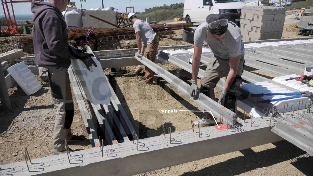 Conformément aux recommandations techniques, elles doivent s’appuyer suffisamment sur les longrines, avec un minimum de 15 mm (consultez l’article Conception du plancher en béton hourdis polystyrène).