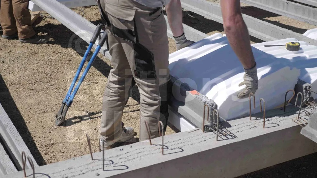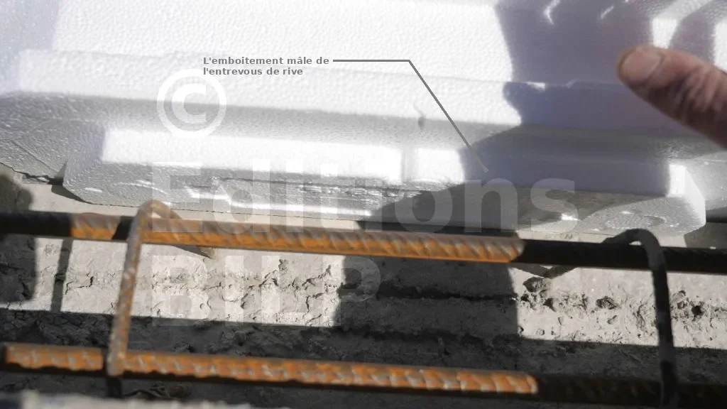Ces hourdis prennent appui sur les longrines de rive par l’intermédiaire de leur emboîtement mâle, d’une part, et grâce aux coupes pour obtenir un appui de 20 mm minimum sur les longrines intermédiaires. En général, ce sont les EcoRupteurs [1] qui sont placés à l’extrémité ; cependant, dans le cas du projet Maison BILP, il s’agit de hourdis en polystyrène ordinaire.