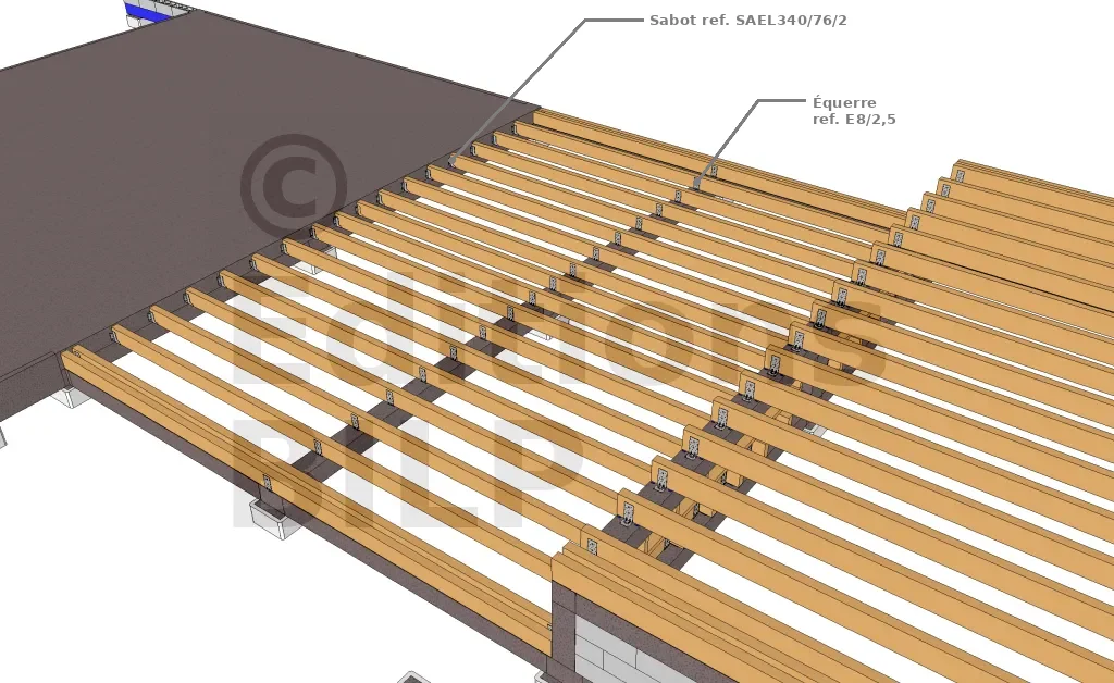 Pour la fixation des solives sur la dalle, nous avons employé des sabots. Pour choisir et dimensionner vos sabots, vous pouvez consulter la rubrique sur comment choisir un sabot ?.