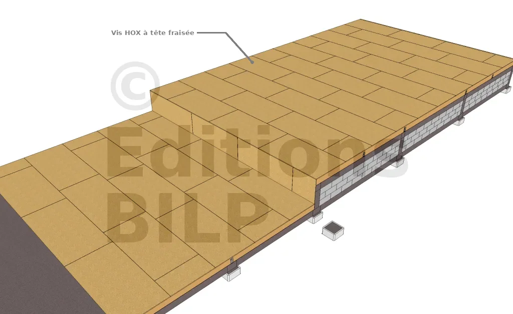 Les tasseaux de la plateforme sont fixés avec des vis HOX à tête fraisée (3) et les OSB y sont fixés avec ce même type de vis mais avec des plus petites dimensions (diamètre et longueur).