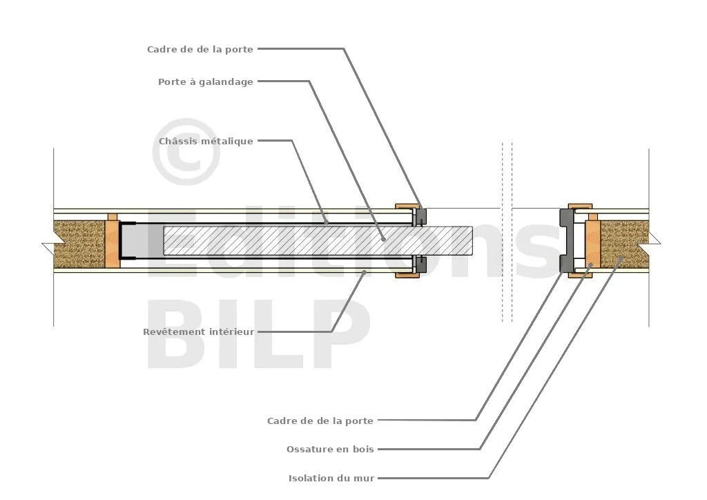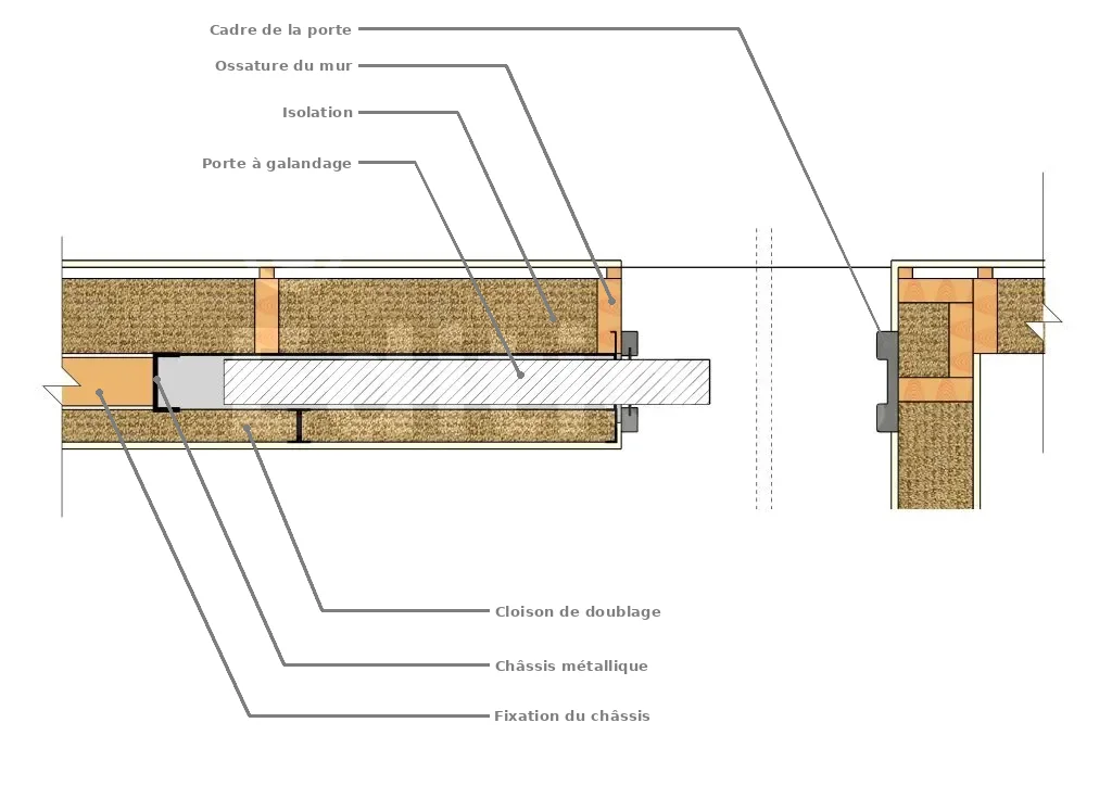 Dans ce cas, la méthode appropriée consiste à concevoir une ouverture suffisamment large pour accueillir à la fois le cadre de la porte et le châssis métallique. Une cloison de doublage est ensuite rapportée en parement du châssis pour permettre le coulissement de la porte.