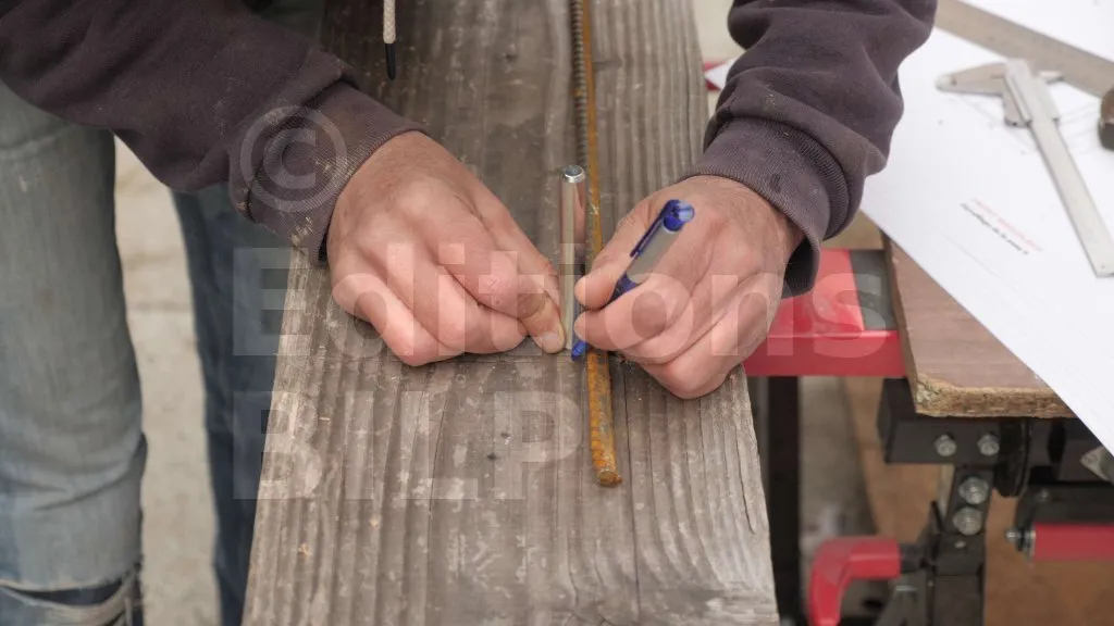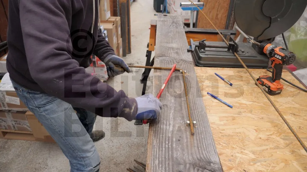 Après avoir pris les dimensions de chaque armature, celles-ci sont rapportées en prenant comme point de référence l’emplacement de la première broche. Le trou destiné à la broche est réalisé à l’aide d’une perceuse équipée d’une mèche à bois de 11 mm de diamètre. La broche est ensuite insérée dans son emplacement en laissant dépasser environ 10 cm au-dessus de la surface du madrier, et les opérations sont répétées pour les autres broches de la même rangée.