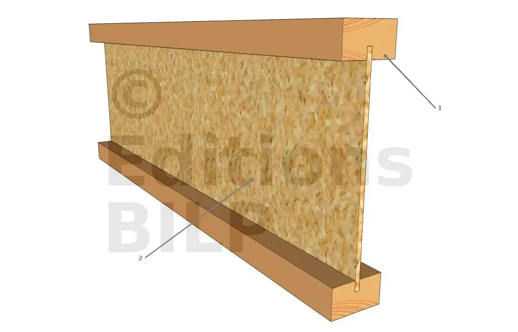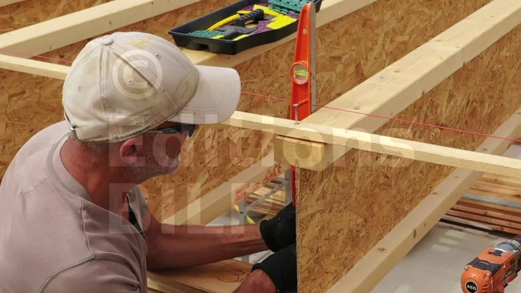 Pour éviter le flambement des poutres avant la mise en place des panneaux de toiture, des entretoises ont été installées. Pour ce faire, des gabarits en planches sont bloqués entre les poutres à l’aide de serre-joints. Ensuite, des lattes (entretoises) sont fixées sur les poutres pour maintenir l’écartement entre elles.