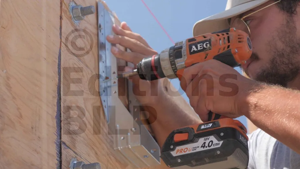 Les poutres sont fixées sur les ossatures des murs à l’aide de deux Vis BOIS structurelle - tête fraisée - filetage partiel.