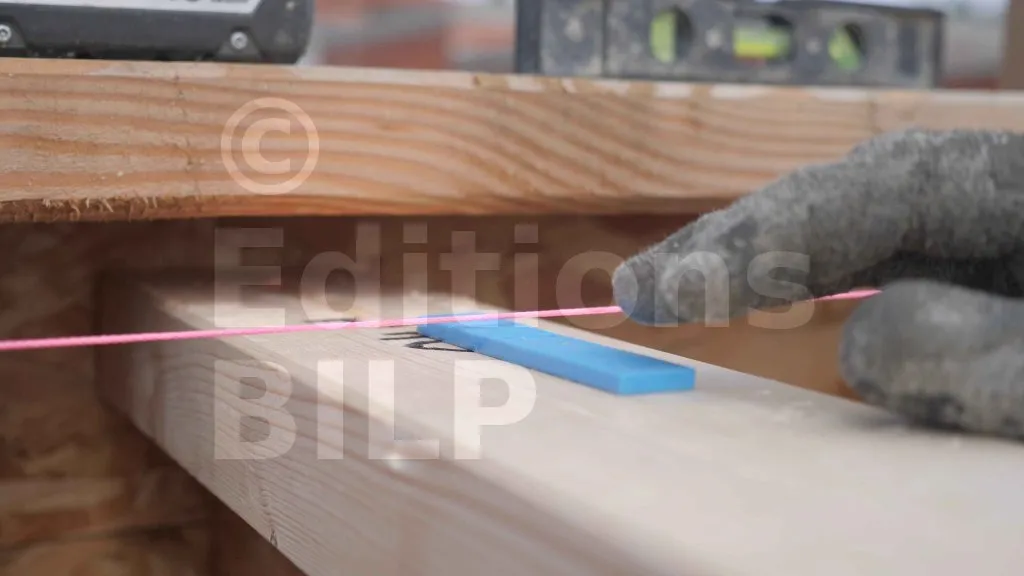 Le cordeau est fixé à une extrémité et tiré jusqu’à l’autre extrémité pour obtenir l’alignement et la pente des poutres. Ensuite, il faut ajouter une épaisseur de cale entre le cordeau et la membrure supérieure des poutres pour créer un petit espace (le jour). En effet, il est possible que toutes les poutres intermédiaires touchent le cordeau, mais que la pente soit incorrecte. Ainsi, c’est cet espace (épaisseur de la cale) qu’il faut conserver pour que la pente soit correcte.