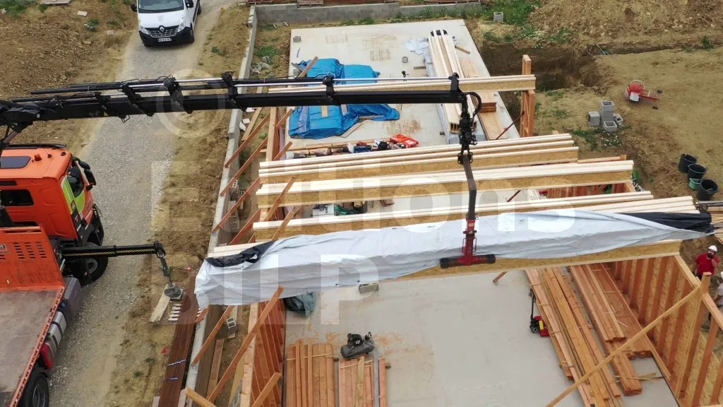 Les poutres de mêmes dimensions ont été emballées ensemble, ce qui a facilité leur mise en place. En effet, les poutres adjacentes sur chaque partie du toit ont les mêmes dimensions et n’ont été déballées qu’une fois positionnées sur les ossatures des murs. Les poutres, prenant appui sur ces ossatures, ont été placées sur les murs à l’aide du camion-grue du livreur.