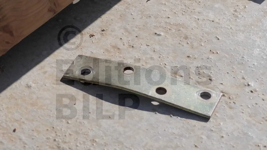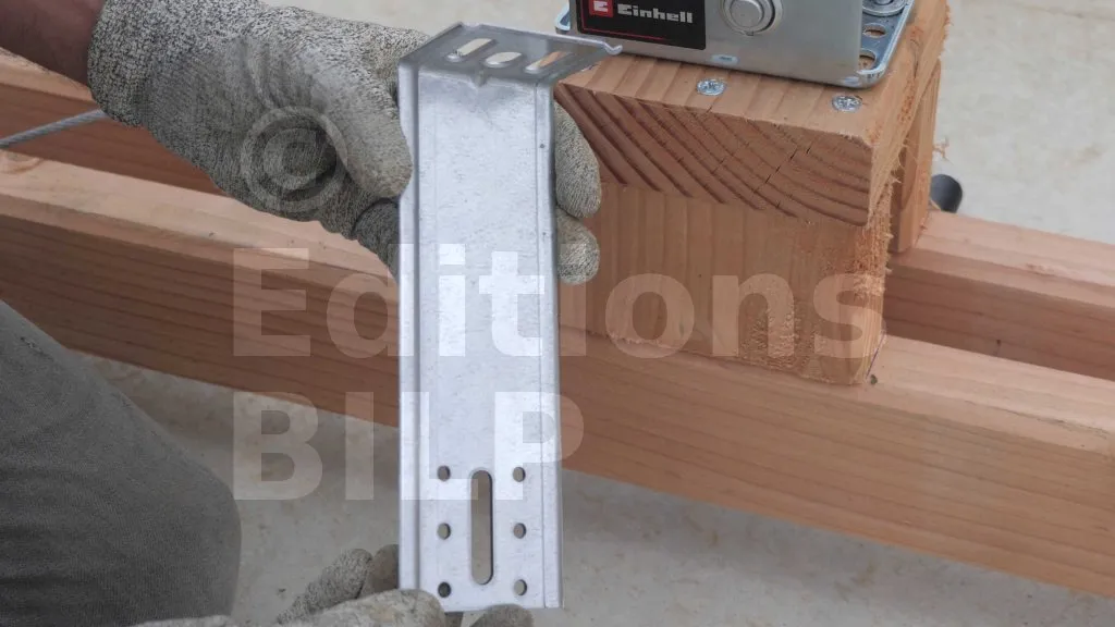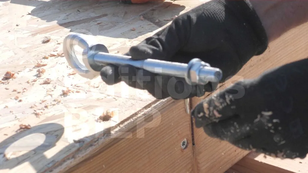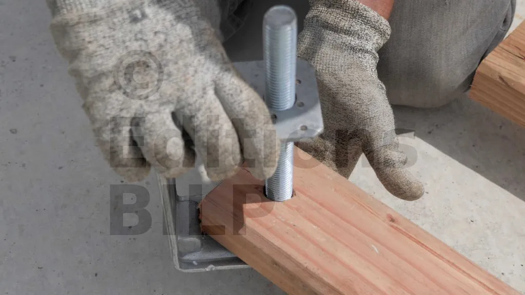 Une fois la vérification effectuée, la tige est fixée sur les chevrons à l’aide de deux écrous et de deux rondelles. Les rondelles sont plaquées contre les bras de levage, puis les écrous viennent consolider le tout.