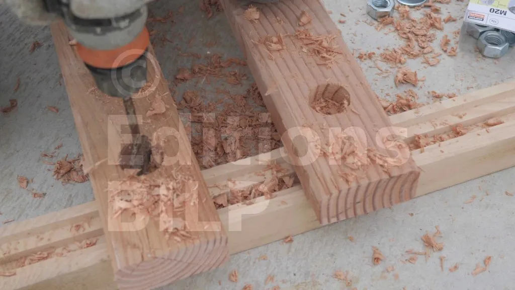 Les épaisseurs des quatre écrous, des quatre rondelles, des chevrons et celle de la poulie sont plus grandes que l’intérieur du pied en U du lève-mur. C’est pourquoi des trous borgnes sont nécessaires pour encastrer deux épaisseurs d’écrous et de rondelles. Ci-après les étapes à suivre :