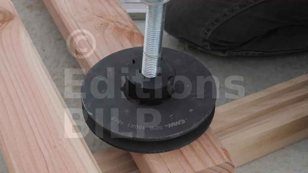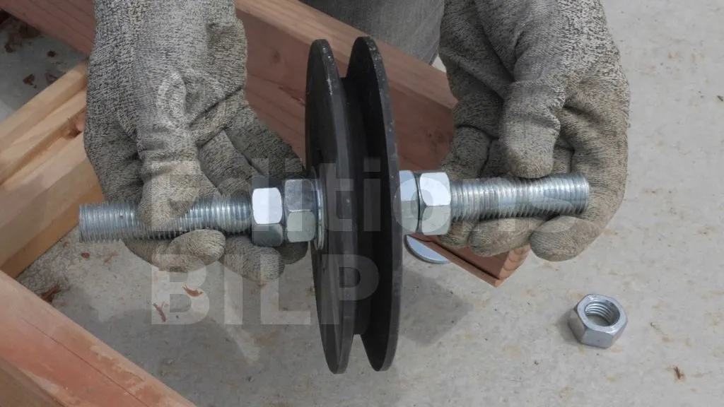 Insérez la tige dans l’essieu de la poulie, puis plaquez deux rondelles contre les disques de la poulie, ensuite mettez en place les écrous qui vont empêcher le déplacement latéral de la poulie sur la tige. Enfin, posez les deux écrous qui vont être encastrés dans les trous borgnes.