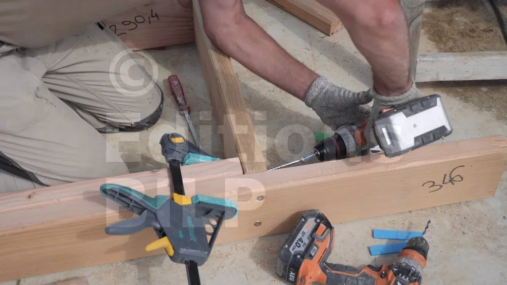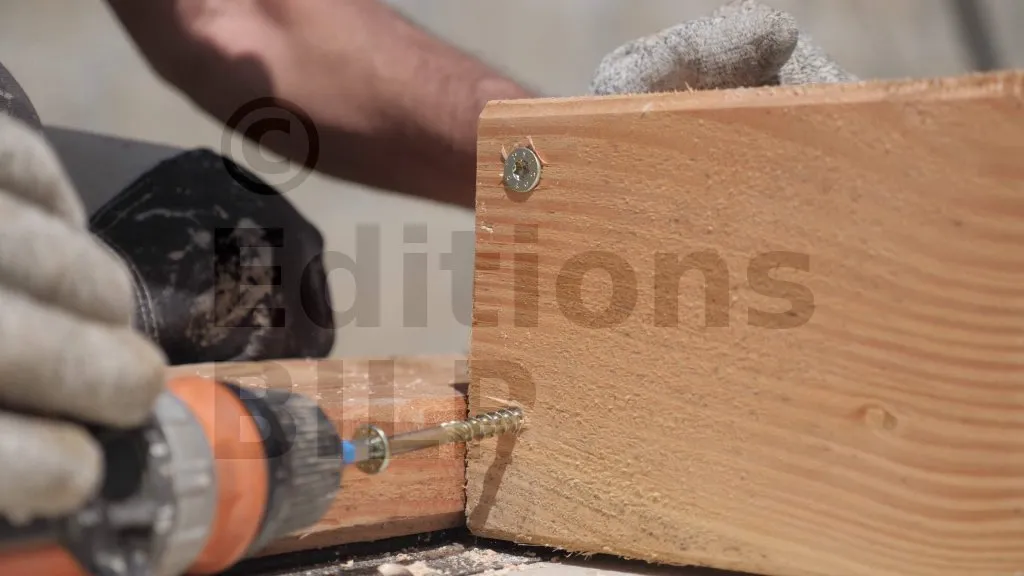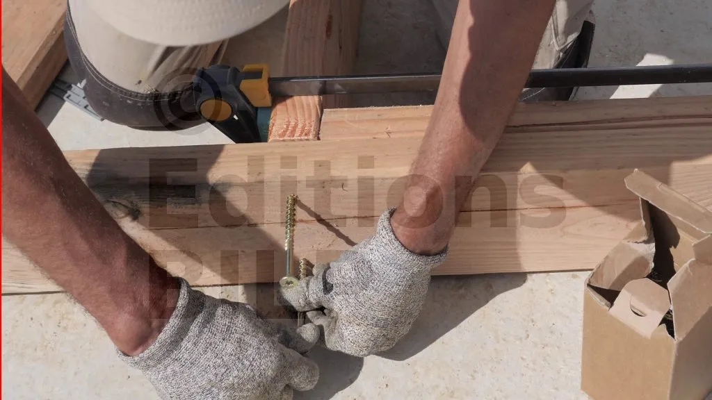 Les montants d’extrémité sont fixés contre la traverse basse à l’aide de Vis BOIS structurelle - tête fraisée - filetage partiel, avec 2 vis par point de contact. Il est toujours nécessaire de pré-percer le bois afin d’éviter son éclatement au moment du vissage.