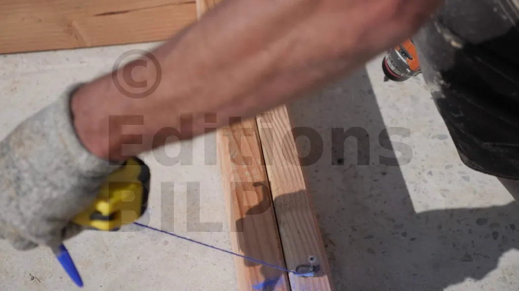 Les voiles de contreventement sont fixés à l’aide de pointes sur l’entraxe des montants de l’ossature. Pour cela, reportez les entraxes des montants sur les voiles de contreventement à l’aide d’un cordeau traceur. Procédez de la même manière que sur l’image « Report des marquages sur les montants intermédiaires » ci-dessus.