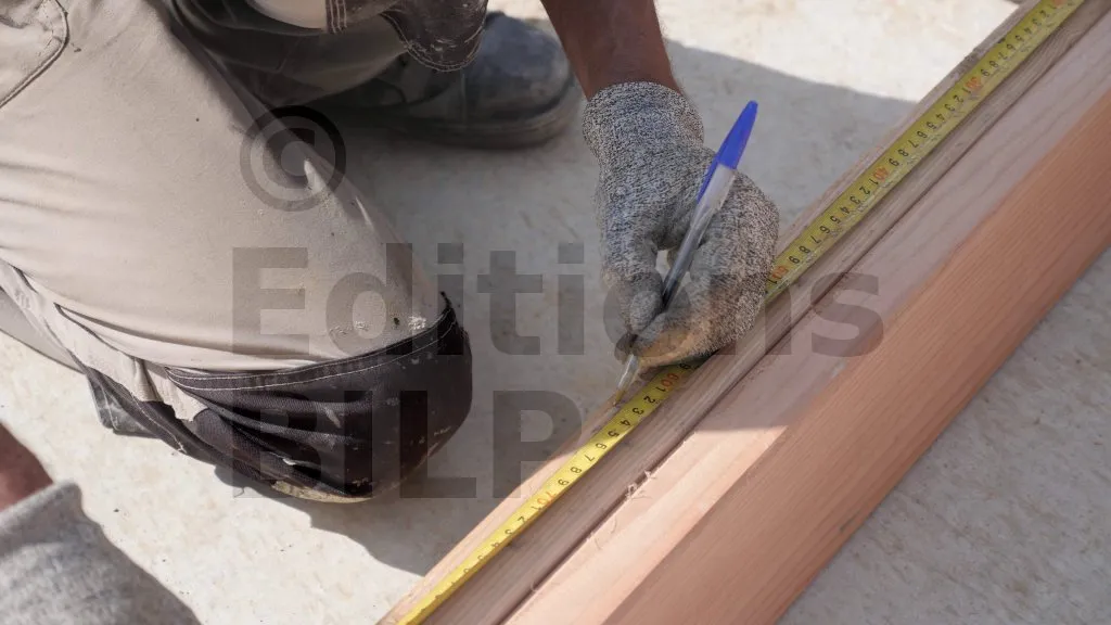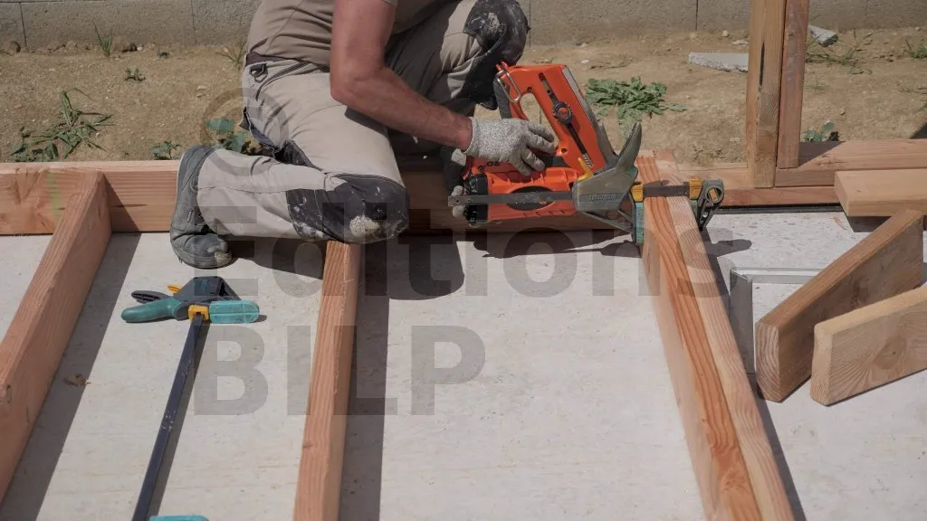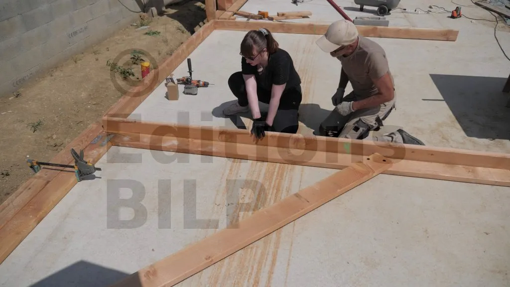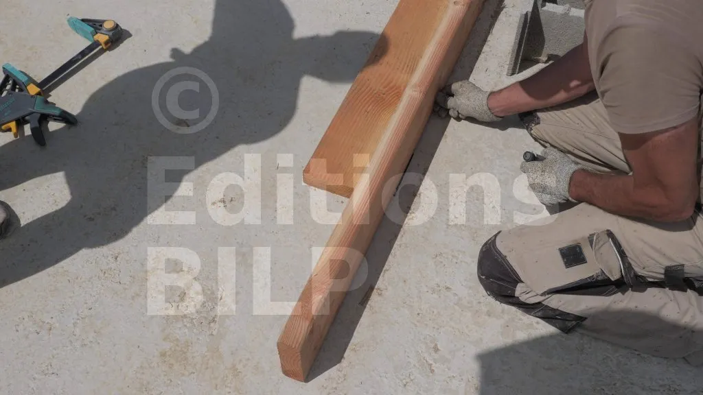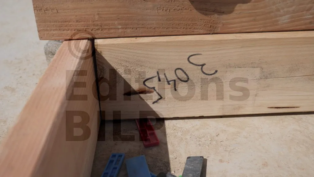 Sur ce projet, la plateforme d’assemblage n’est pas complètement plane, ce qui nécessite le réglage de la planéité des éléments d’ossature entre eux. Pour ce faire, des cales en plastique sont utilisées pour les ajustages.