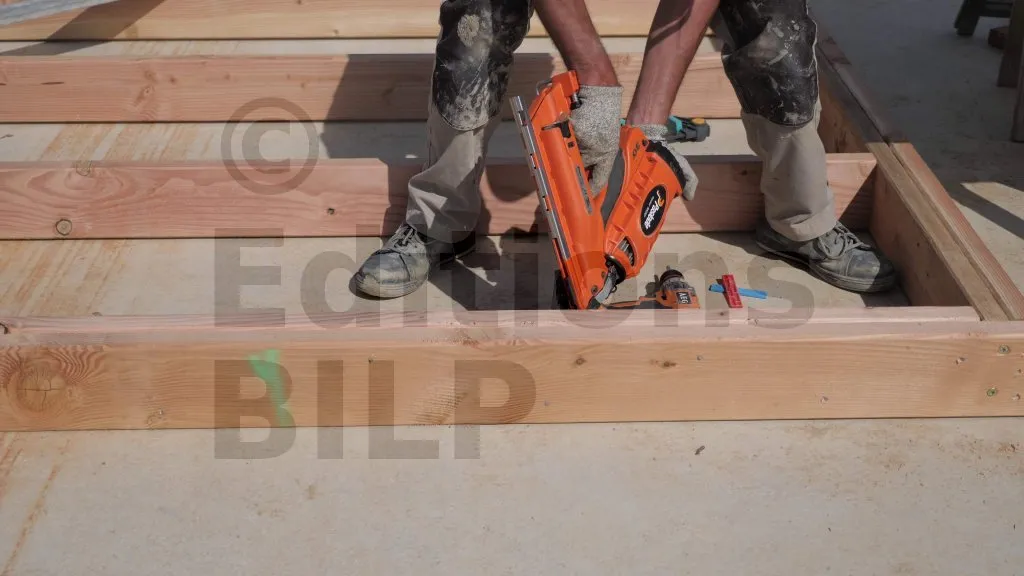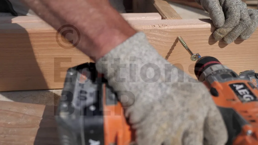 Les lisses hautes sont fixées contre les montants d’extrémité à l’aide de Vis BOIS structurelle - tête fraisée - filetage partiel, avec deux vis à chaque point de contact. Pour ce faire, bloquez-les sur les montants de renfort. Ensuite, pré-percez les points de fixation et procédez au vissage.