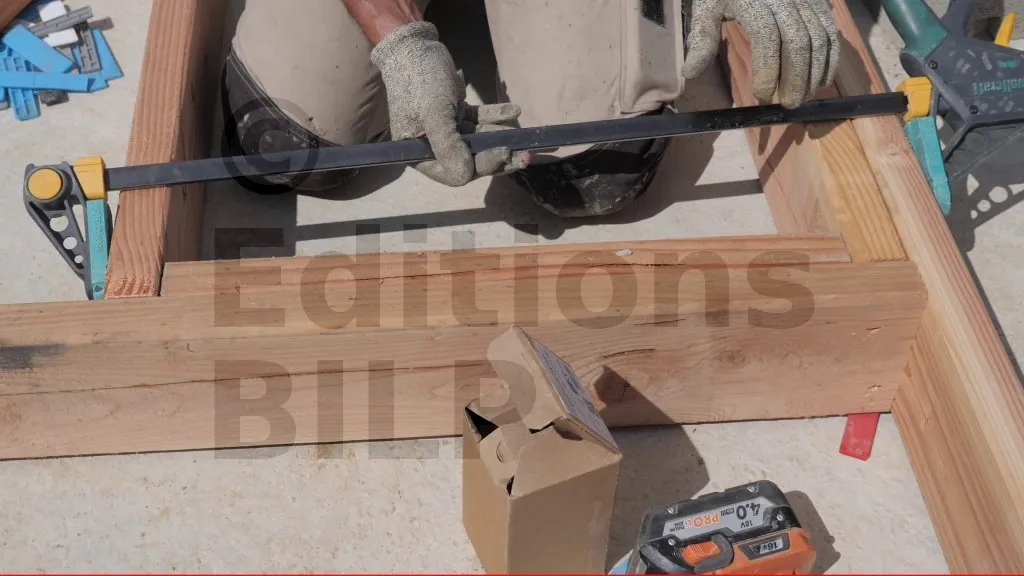 Le système de cette grande équerre permet un réglage facile : il suffit de bloquer la traverse basse et le montant avec l’équerre à l’aide de serre-joints, puis de procéder aux fixations.