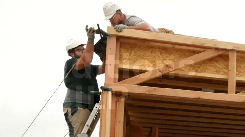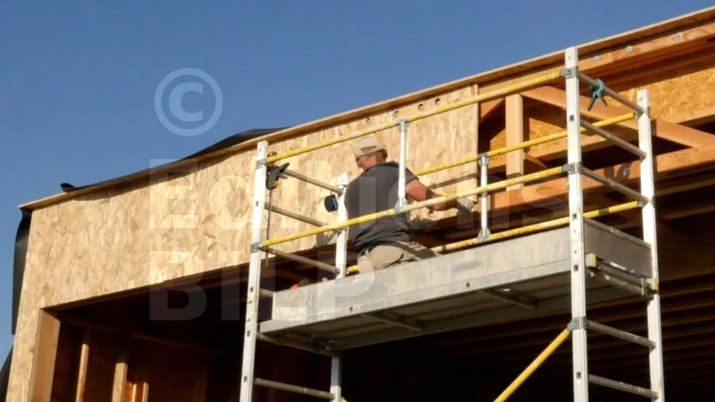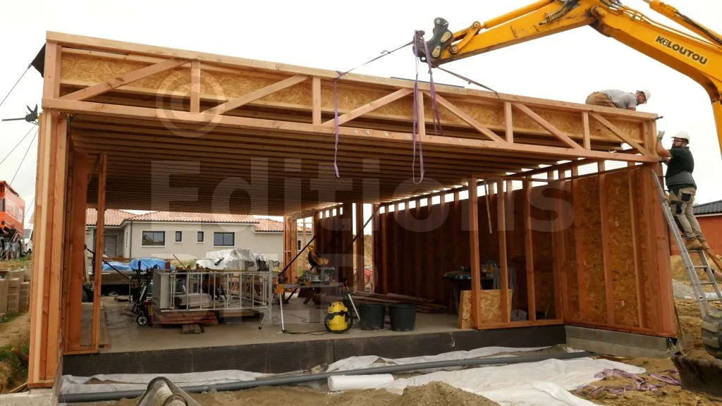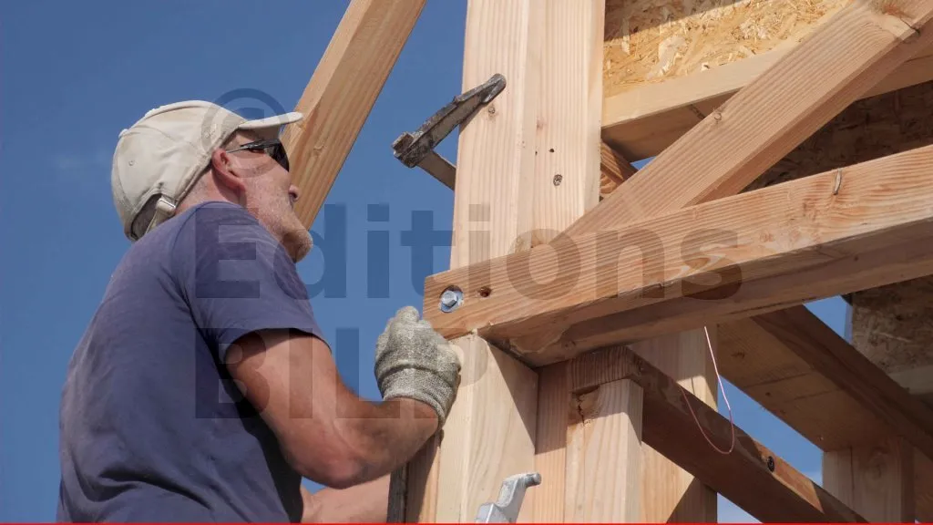 - La dernière met le treillis dans le sabot et règle l’alignement sur la lisse haute de l’ossature du mur.