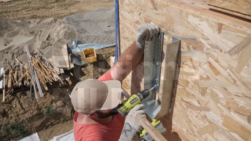 Avant de poser le sabot, son emplacement doit être tracé sur les panneaux de contreventement du mur. Il est fixé contre les panneaux au niveau des montants de l’ossature du mur avec six vis de connections tête ronde large.