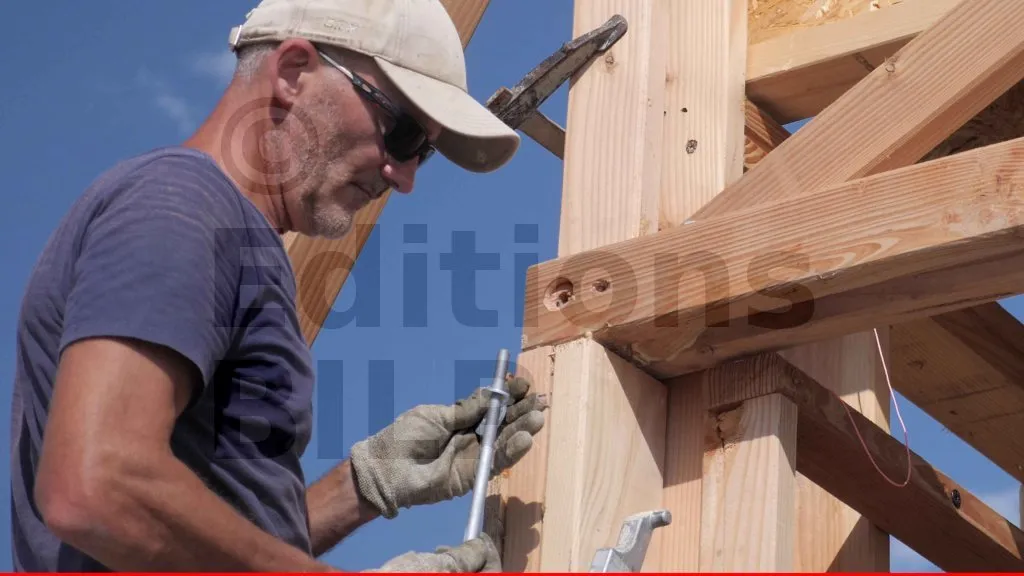 Les boulons de charpente et les écrous à tête hexagonale sont mis en place ; il est important de ne pas oublier les deux rondelles sur chaque boulon. Une fois les écrous bien serrés, les serre-joints (fixations provisoires) peuvent être enlevés.