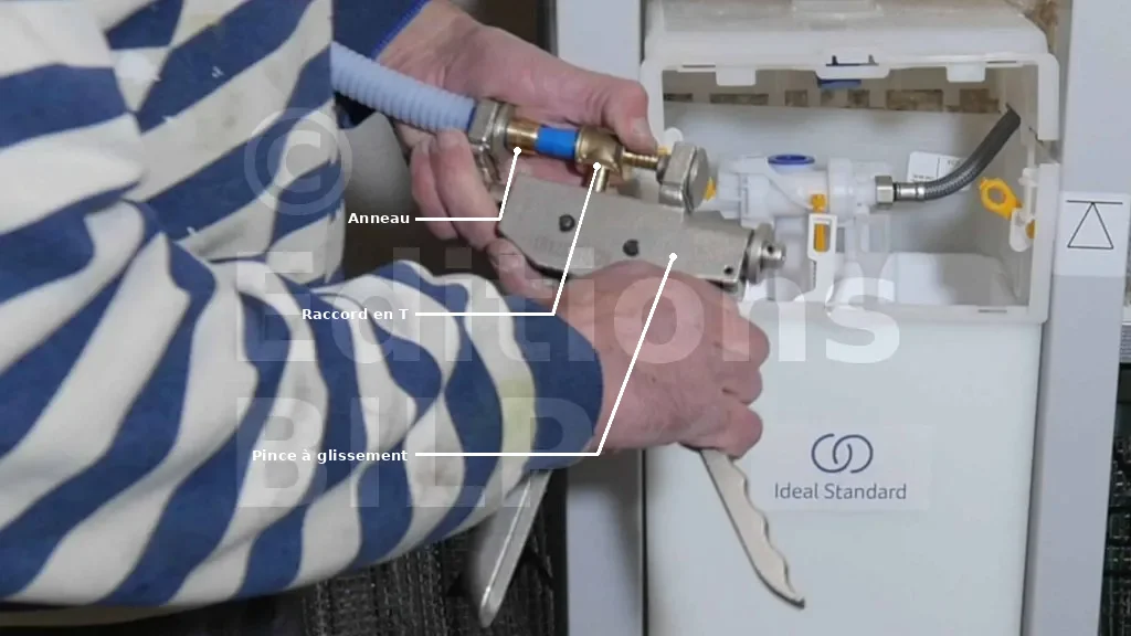 Pour raccorder le réservoir encastré et la douchette, nous avons d’abord fermé l’arrivée d’eau afin de travailler en toute sécurité. Ensuite, nous avons mesuré et ajusté la longueur du tuyau PER en fonction de la distance entre la source d’eau et le réservoir. Pour assurer une distribution efficace, nous avons utilisé un raccord en T permettant de diviser l’arrivée d’eau en deux circuits distincts : l’un destiné à l’alimentation du réservoir encastré et l’autre à la douchette hygiénique. Afin d’assurer un raccordement fiable et étanche, nous avons glissé une bague de serrage sur le tuyau avant de l’assembleur au raccord en T à l’aide d’une pince à glissement, garantissant ainsi une fixation solide et durable. Enfin, nous avons vérifié la bonne fixation des connexions avant de rouvrir l’arrivée d’eau et tester l’ensemble du système pour s’assurer de l’absence de fuite et du bon fonctionnement de chaque élément.
