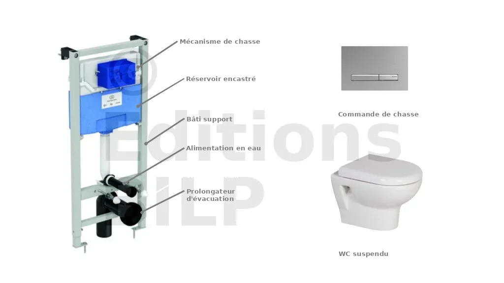La première étape consiste à installer le support du WC suspendu, qui est essentiel pour la solidité de l’ensemble. Le châssis métallique, qui soutient le WC, doit être fixé à la fois au sol et au mur. Pour ce chantier, il y a deux niveaux de plancher, et il se trouve que les points de fixation sur le mur sont situés au niveau du plancher supérieur. C’est à cet endroit que nous allons fixer le support.