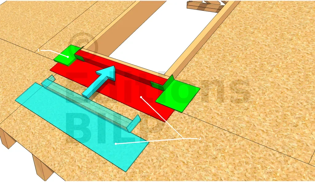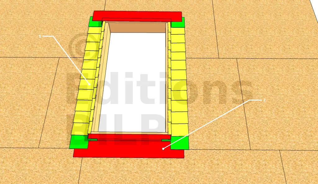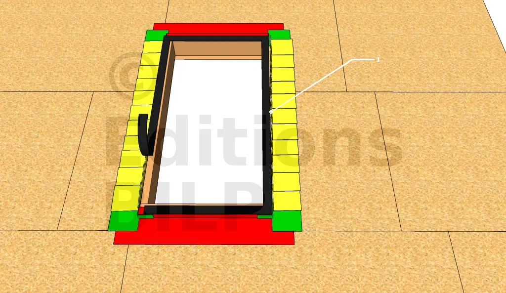 - 2 : Étanchéité extérieure : éléments du bas. Cette pièce est découpée dans un large bande d’étanchéité bitumeuse.