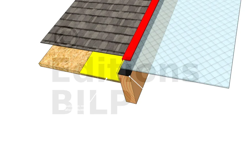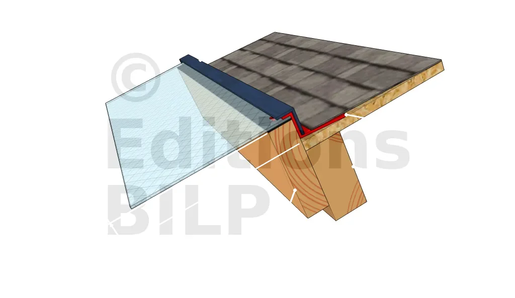 Une fois le larmier du haut installé, remettre la toiture du dessus sur la partie inférieure du larmier haut. Le larmier en aluminium haut possède une partie sur laquelle lune partie du bardage ou toiture est installer afin d’assurer l’étanchéité extérieur et éviter tout infiltration d’eau.
