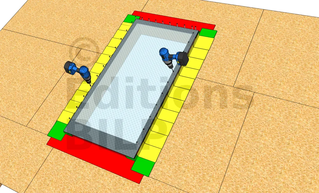 Depuis l’intérieur de la pièce, tracez un cadre pour localiser et marquer les quatre coins de la lucarne. Idéalement, le cadre se situe entre deux chevrons. Plantez quatre clous assez longs à l’intérieur des chevrons juste sur les marquages où les coins devraient être. Bien localiser la pointe du clou de l’extérieur. Marquez le périmètre de la lucarne en traçant une ligne de craie reliant les pointes des clous. Puis hachurer la partie à enlever avant d’enlever les clous. A partir du dessus, percer l’ouverture avec une scie circulaire ou scie sauteuse tout en suivant la ligne tracée ultérieurement.