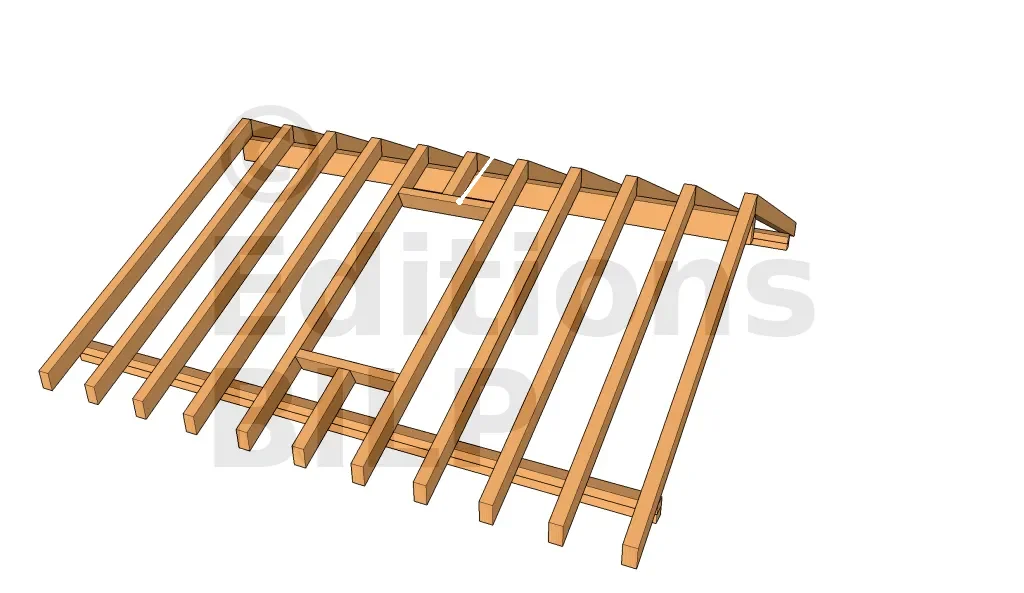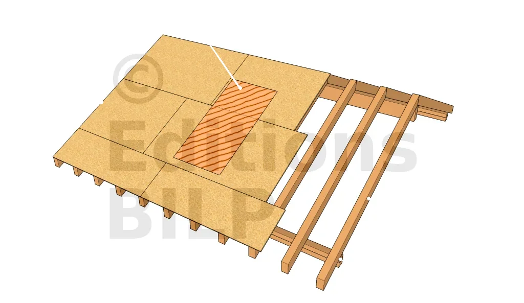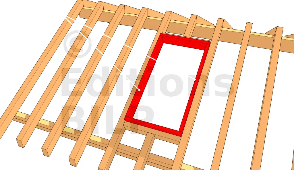 Souvent, il faut découper un chevron se trouvant dans la surface à enlever. Il est important donc de renforcer le toit par des chevêtres installés de part et d’autre de l’ouverture. La longueur des chevêtres à installer est égale à la distance entre les deux chevrons intacts. Sciez deux poutres de cette longueur et clouez-les à l’emplacement désigné. Bien s’assurer que les chevêtres et les chevrons sont bien d’équerre.