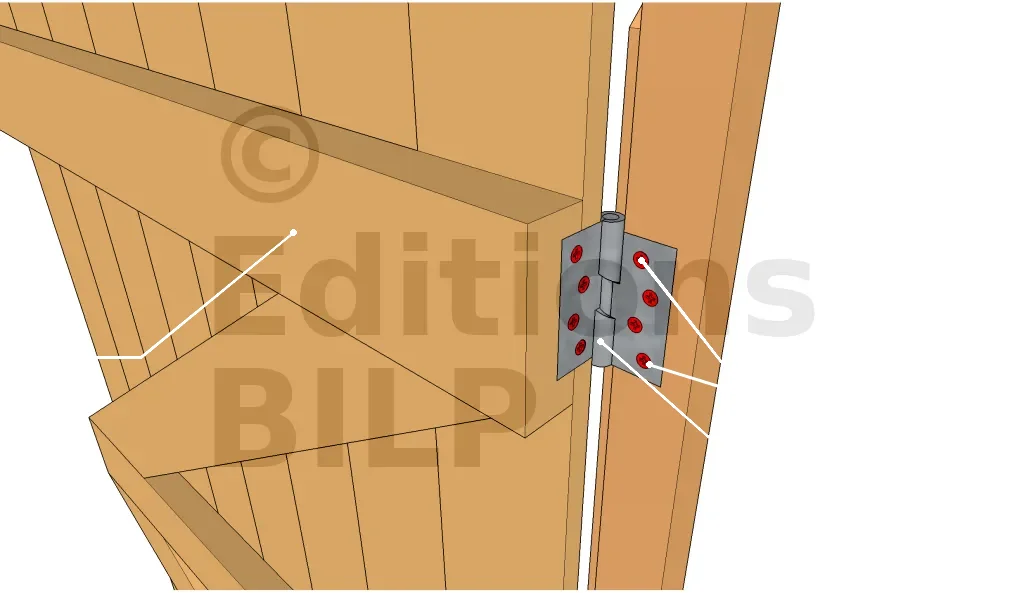 Les charnières sont fixées par des vis. En effet, comme ces dernières ont une meilleure résistance en cisaillement que les pointes, elles sont donc plus adaptées puisqu’elles devront supporter tout le poids du battant.