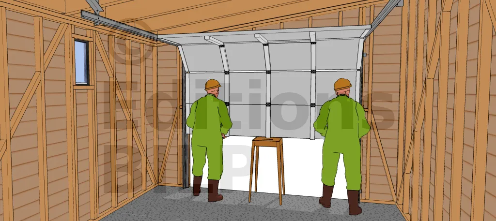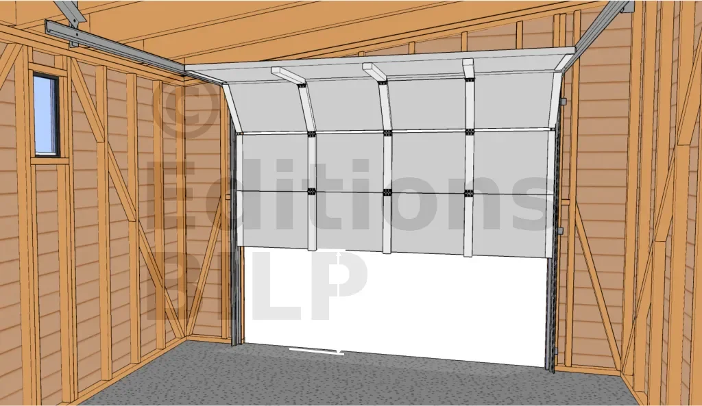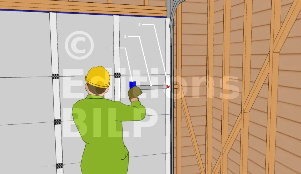A cette étape, selon le modèle de votre porte de garage, vous pouvez installer la barre d’enroulement au-dessus des montants ou bien fixer les charnières de chaque panneau. Nous allons supposer que cette barre n’existe pas pour notre modèle.
