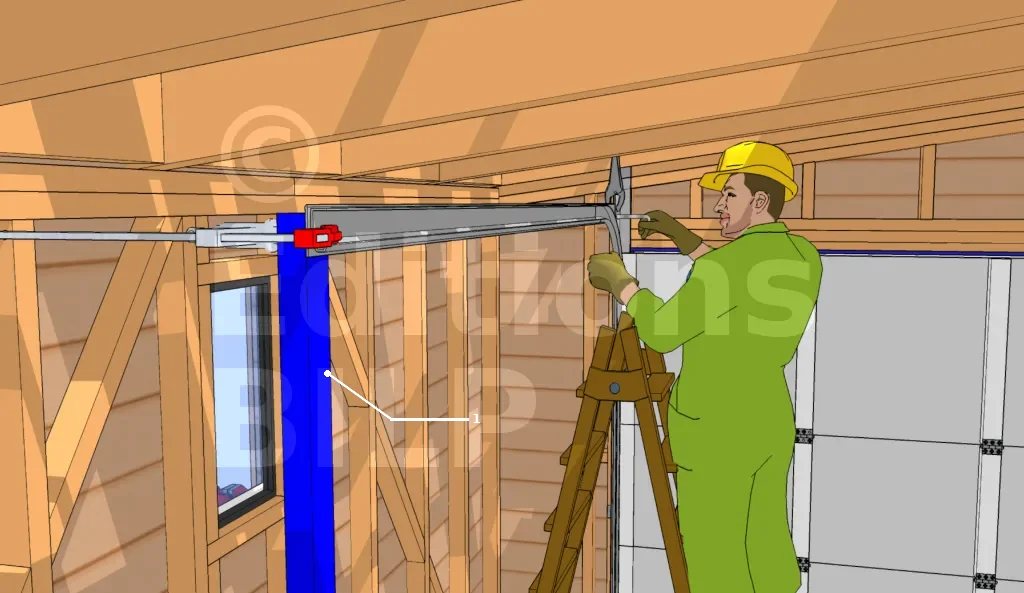 - Fixer ensuite l’attache-rail au mur à ce point. Si ce point n’est pas sur un montant au-dessus du linteau, il faut ajouter une pièce solide à cet endroit.