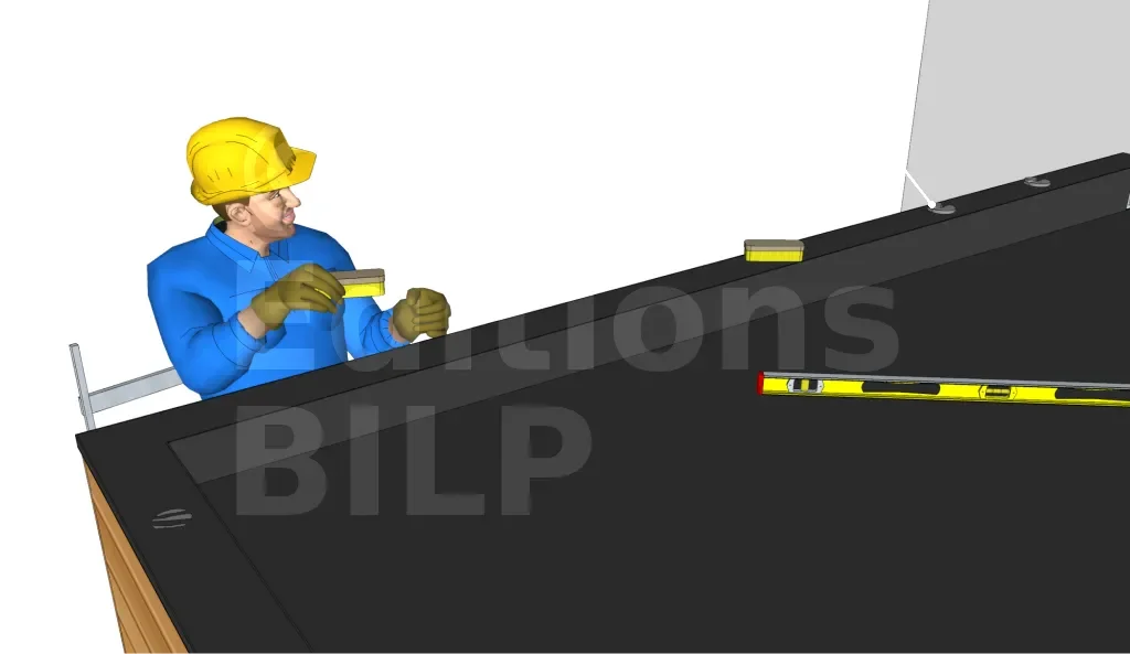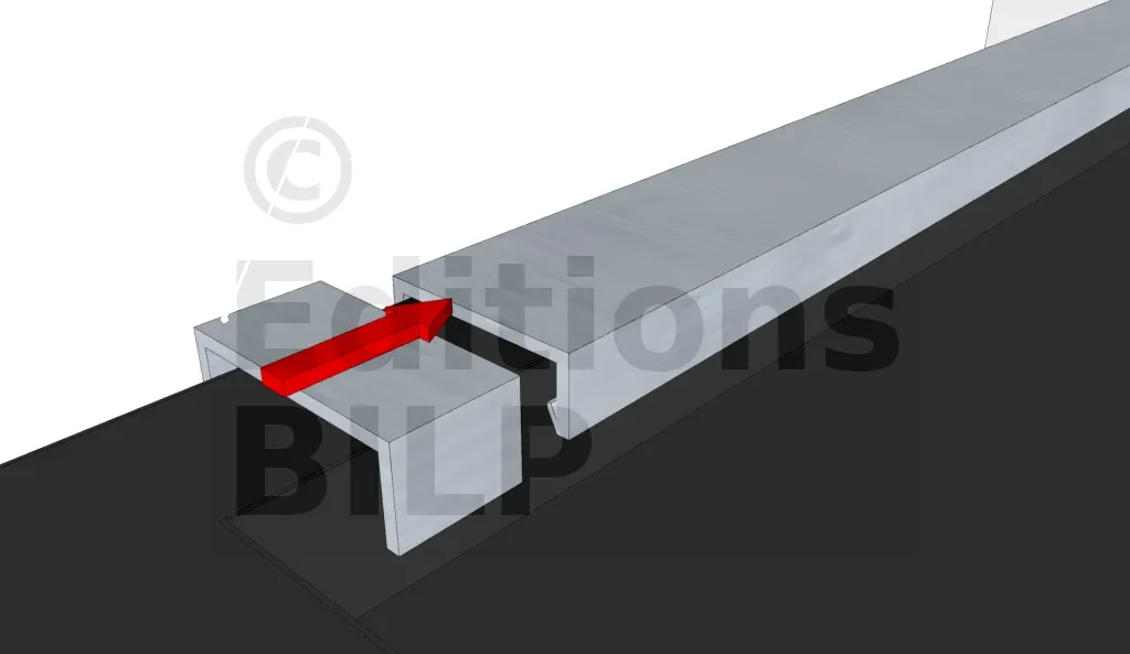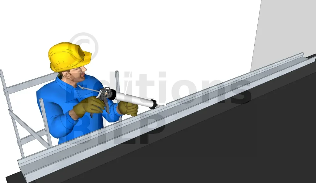 Pour commencer, vous aller mettre du silicone à l’intérieur de la couvertine d’angle. Puis, sous l’éclipse qui a été placé précédemment, vous allez également y mettre du silicone. Enfin, vous allez appuyer fortement sur la couvertine d’angle pour la faire adhérer à la colle tout en la coulissant sous l’éclisse.