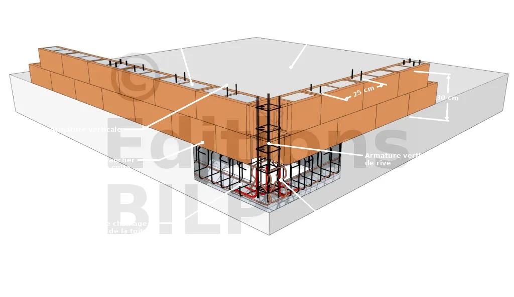 Des armatures horizontales peuvent être disposées dans les gorges latérales des blocs à bancher et sont liées aux