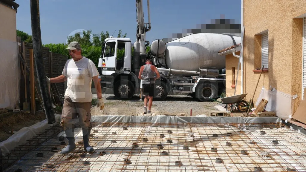 Astuce : lorsque le niveau du béton est atteint, il faut mettre de côté une petite quantité de béton qui va nous servir lors de la finition (dans une brouette par exemple).